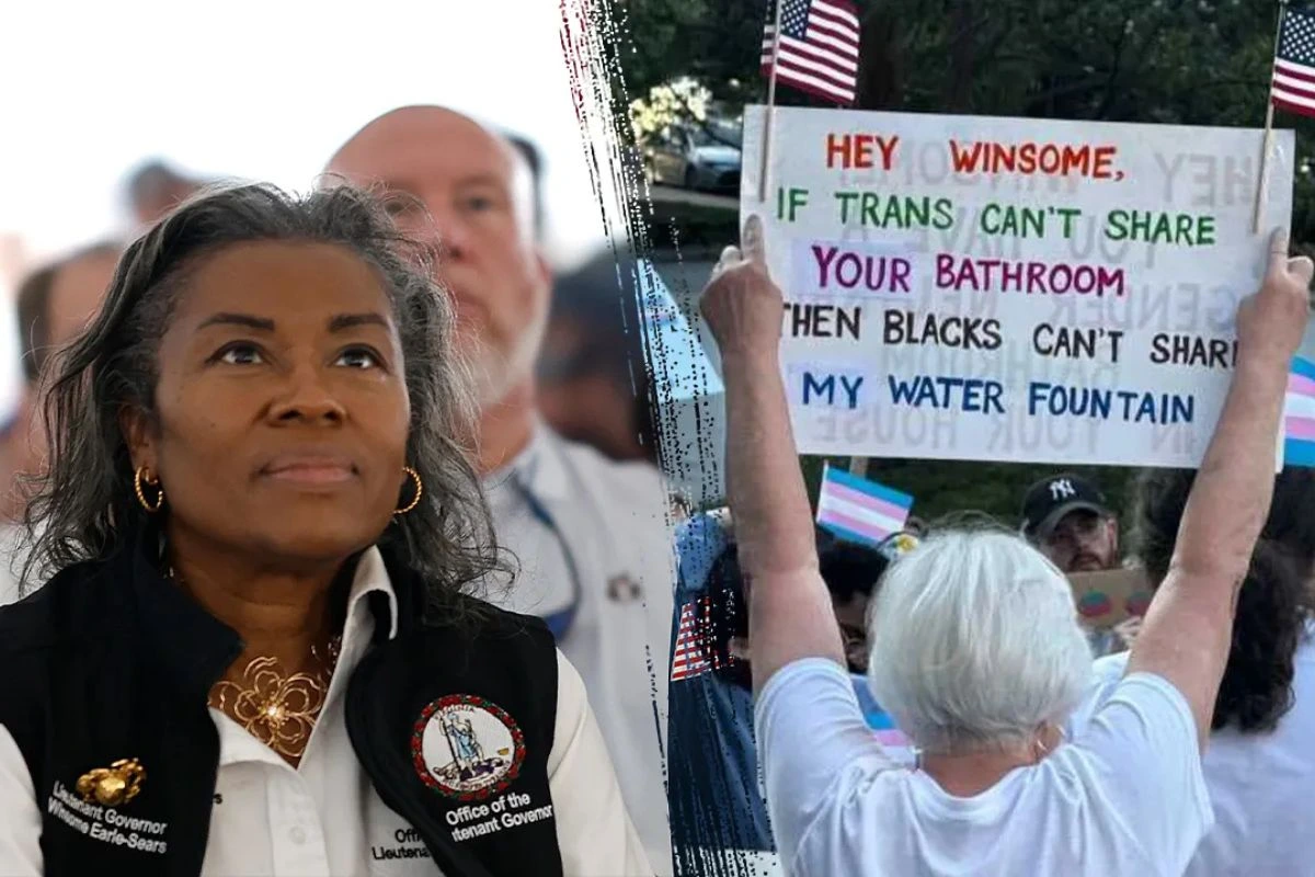 “It’s a shame,” Earle-Sears told 7News about the sign. “She was holding up that sign for a whole hour, Nick, and nobody said to her to take it down. They’re spewing hate. The very hate that they say we on the Republican side are doing is what they’re doing, and it’s a shame. And remember who I am. I’m an immigrant to this wonderful country, and not only that, but I’m a Black woman, and so I’m second in command in the former capital of the Confederate States, for her to talk about a water fountain that Blacks – so she started with me, she started with me and then she went to Black people in general – can’t be at her water fountain. When did you start owning the water fountains, my good friend? And I thought the water fountains belong to everybody. Are we going back to Klan days now? Is that what you’re saying? But you’re a Democrat. You know, none of this makes any sense. And all I’m trying to do is to say parents are trying to raise their young boys, for example, to respect women, to honor women. And yet we have school systems, Loudoun school system, that wants to force these young boys to undress in front of biological girls, so they’re getting in the way of a parent who wants to raise their child properly. And then we have other school systems like Arlington, Alexandria, Prince William, Fairfax, and Loudoun, of course, who say, well, ‘Title IX doesn’t really matter’, and that, yes, they will force young girls even to undress in front of biological men.”