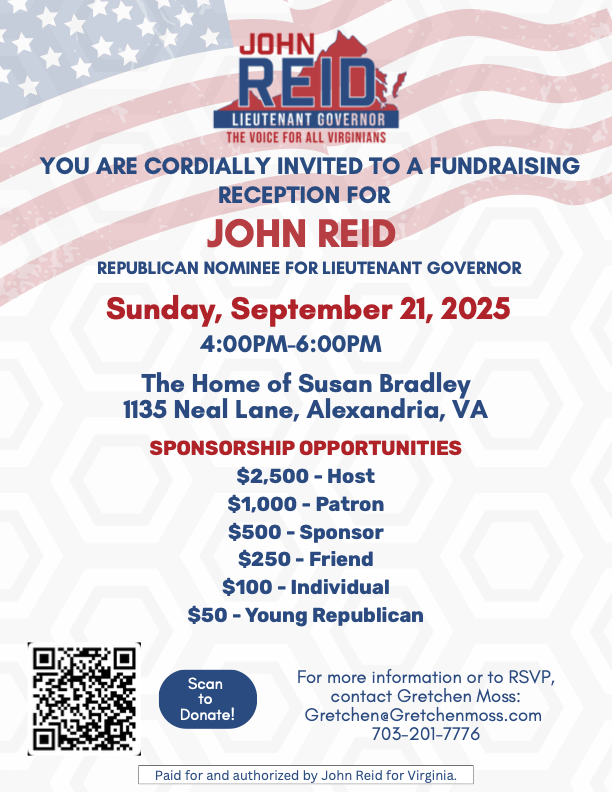 Sep 21 4:00 PM - 6:00 PM Reception for John Reid, candidate for Lt. Governor of Virginia Private venue Oakton Event Details Get Directions