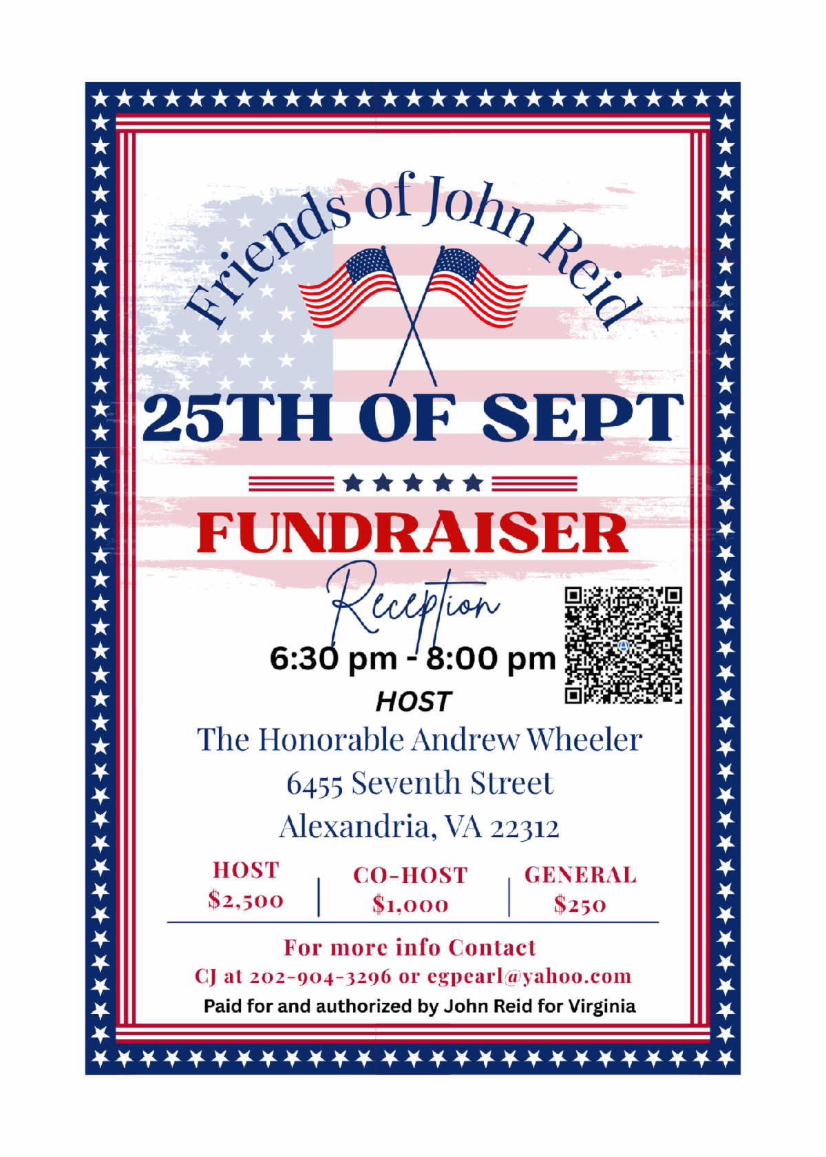 Sep 25 6:30 PM - 8:00 PM John Reid Fundraiser The Honorable Andrew Wheeler 6455 Seventh Street, Alexandria Event Details Get Directions