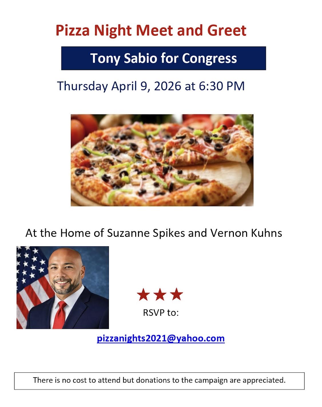 Apr 9 Pizza Night Meet & Greet for Tony Sabio for Congress 6:30 PM - 8:30 PM RSVP for Address Fairfax County, VA Event Details Get Directions