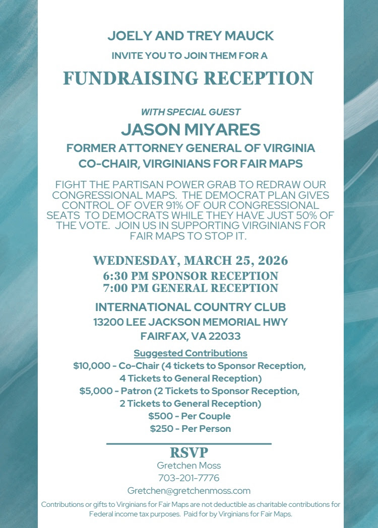 Mar 25 Virginians for Fair Maps Fundraiser 6:30 PM - 8:00 PM International Country Club 13200 Lee Jackson Memorial Drive, Chantilly Event Details Get Directions
