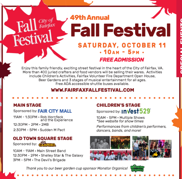 Oct 11 10:00 AM - 5:00 PM Fairfax City Fall Festival Executive Press 10412 Main St., Fairfax Event Details Get Directions