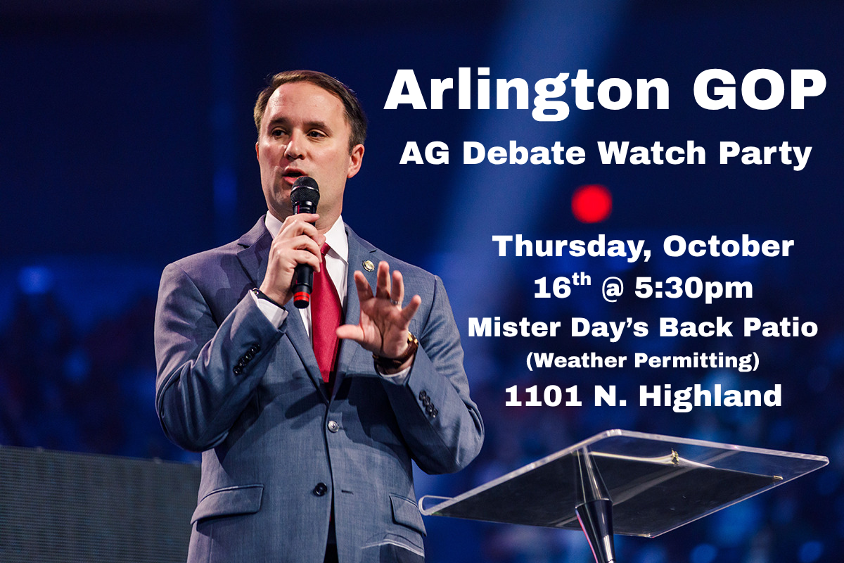 Oct 16 5:30 PM - 7:00 PM Arlington GOP AG Debate Watch Party Mister Day's 1101 N. Highland St., Arlington Event Details Get Directions