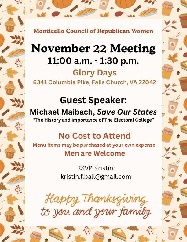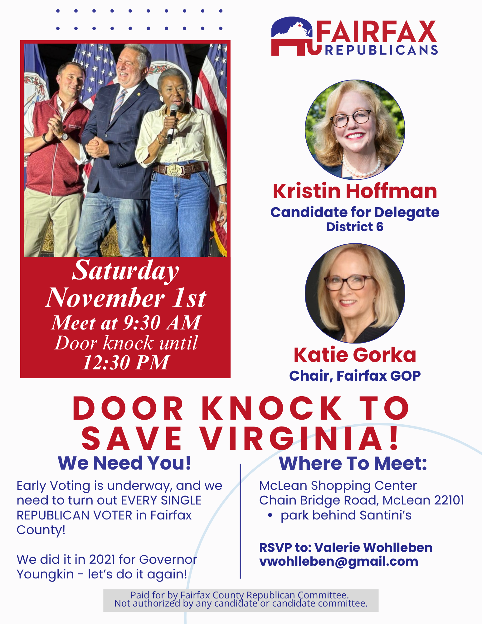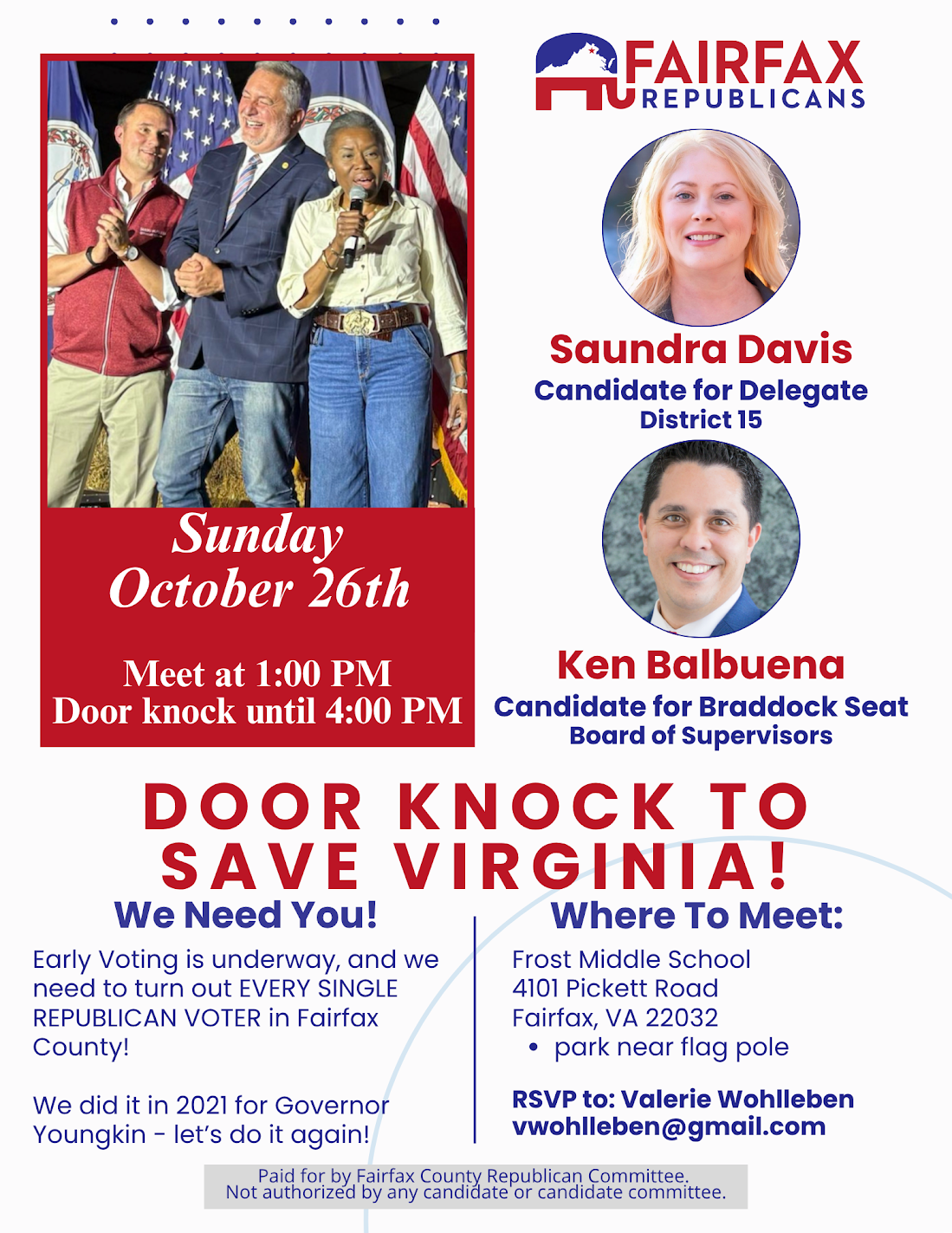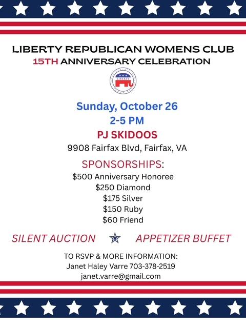 When: Sunday, October 26 @ 1:00 - 4:00 PM Where: Frost Middle School, 4101 Pickett Rd, Fairfax, VA 22032 RSVP: Valerie Wohlleben at vwohlleben@gmail.com Saundra Davis, Candidate for Delegate District 15 Ken Balbuena, Candidate for Braddock Seat Board of Supervisors Learn about other GOP candidates: HERE Not sure what House of Delegates district you live in? Find […]