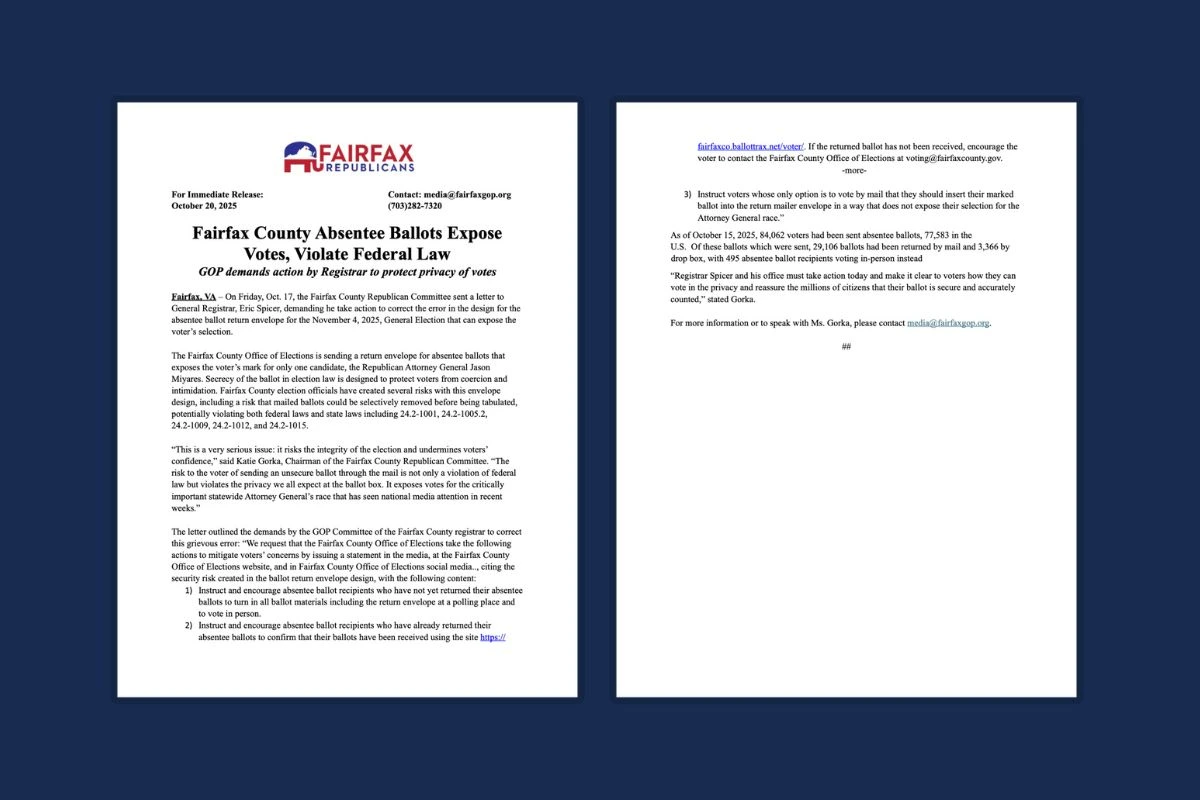 Fairfax, VA – On Friday, Oct. 17, the Fairfax County Republican Committee sent a letter to General Registrar, Eric Spicer, demanding he take action to correct the error in the design for the absentee ballot return envelope for the November 4, 2025, General Election that can expose the voter’s selection.