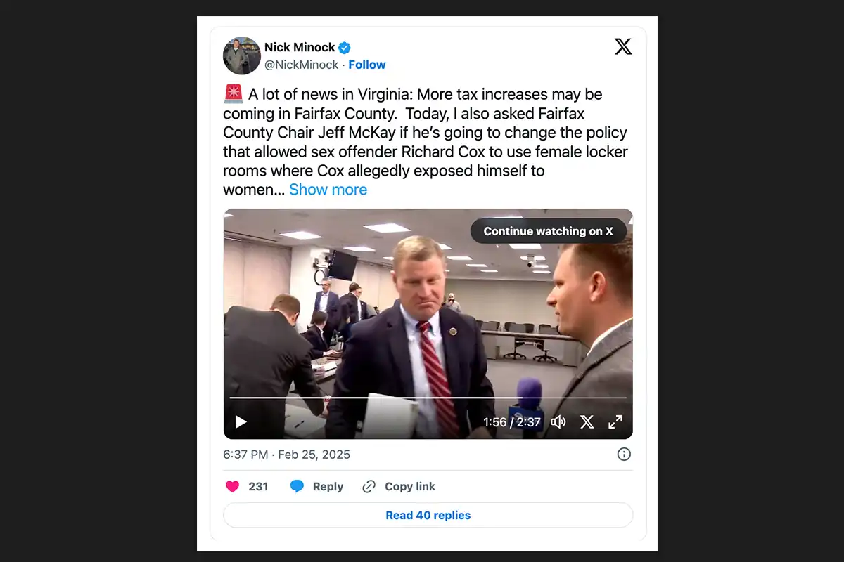 When asked if he would change the county’s policy that allows biological men into women’s facilities following the event, McKay remained silent and attempted to flee the reporter’s questions, according to a video posted by WJLA-TV ABC reporter Nick Minock to X. McKay also refused to answer whether he was aware of the sex offender’s presence in the community center and eventually fled into a bathroom to avoid further questioning.