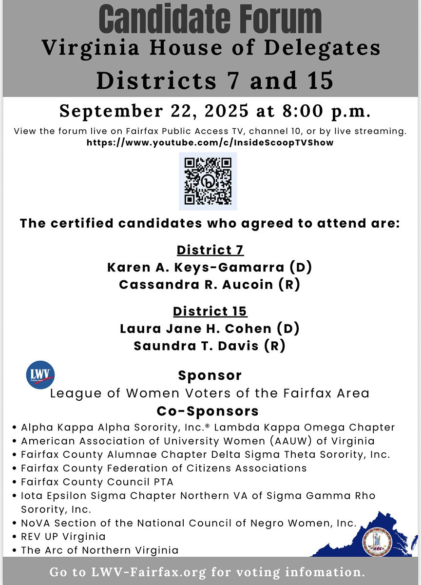 Fairfax Public Access, Channel 10 TVRepublican Stewart Whitson vs Democrat James Walkinshaw Monday, August 18th at 8 PM More Info: https://www.lwv-fairfax.org/2025-candidate-forums Watch the forum live on Fairfax Public Access, Channel 10 TV and/or live streamed here. During the live broadcast, viewers may call in questions using the number on the screen.Sponsor: League of Women Voters of the Fairfax Area
