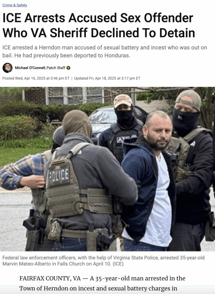 Our children are at risk. Fairfax County officials released a convicted child sex offender back into our community rather than cooperating with federal immigration authorities. In January, the Herndon man was arrested on incest and sexual battery charges, but Fairfax County Sheriff Stacey Kincaid declined to honor an ICE detainer request and instead released him. Patch