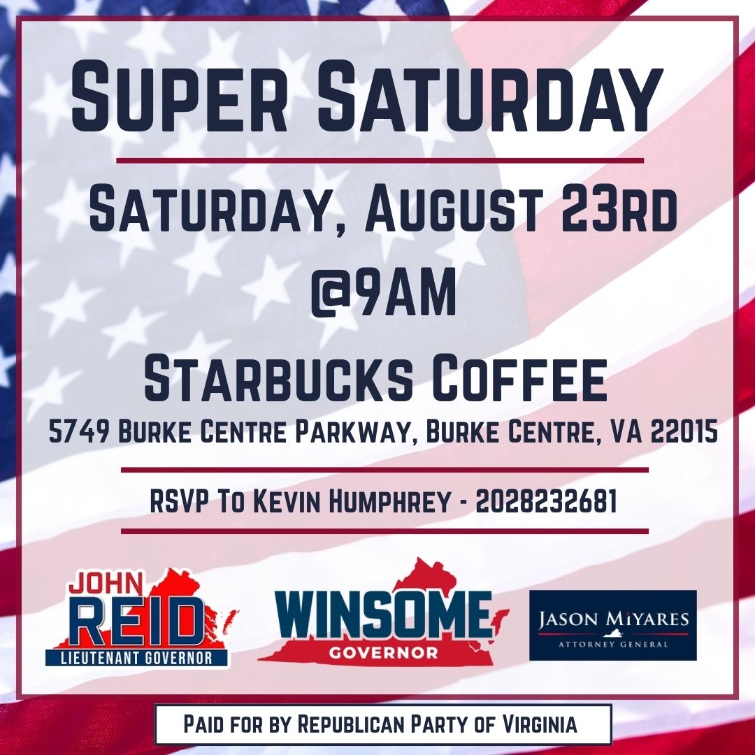 Join us this Saturday to doorknock for our outstanding statewide ticket: Winsome Sears, John Reid and Jason Miyares. Our goal is a sweeping Virginia Victory on November 4th! When:  Saturday,…
