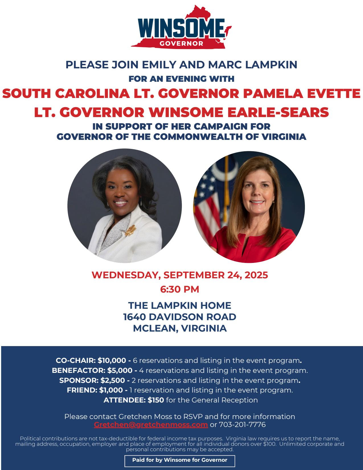 When:  Wednesday, September 24 @ 6:30 PM Where: Lampkin residense, 1640 Davidson Rd, McLean, VA RSVP & More Info: Gretchen Moss at Gretchen@gretchenmoss.com or 703-201-7776